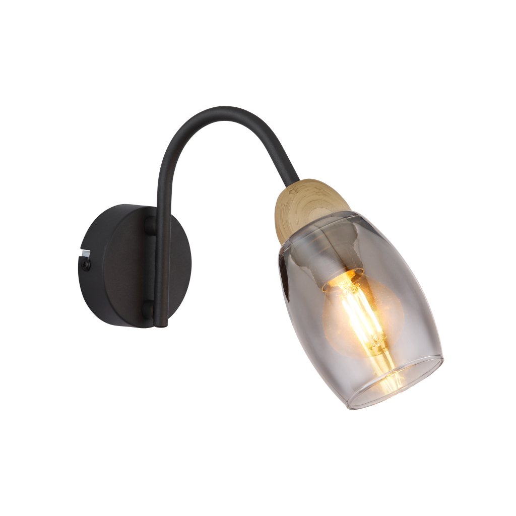 Nástenné svietidlo kov čierny matný, sklo dymové, kov imitácia dreva, smer svetla: nadol, ŠxV: 80x175mm, H: 220mm, bez žiarovky 1x E14 25W 230V