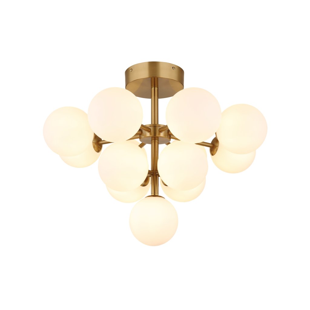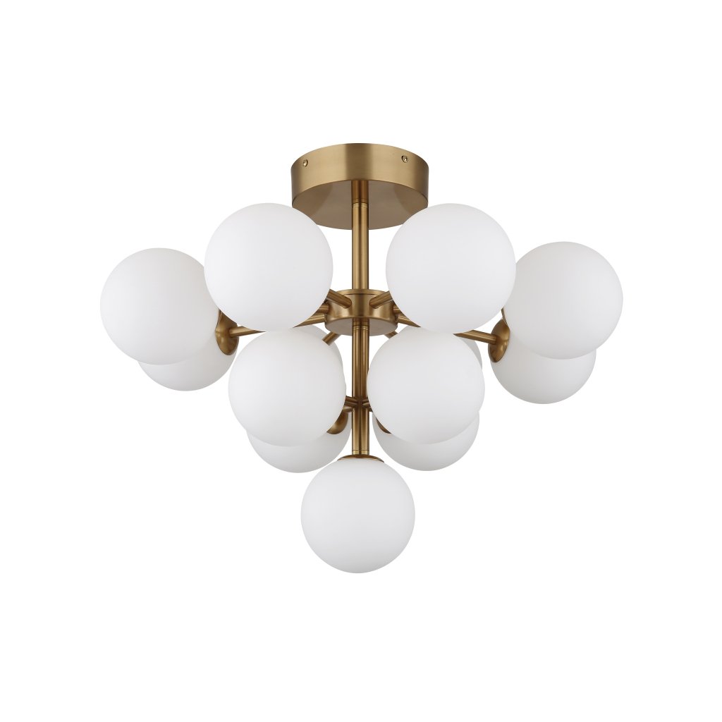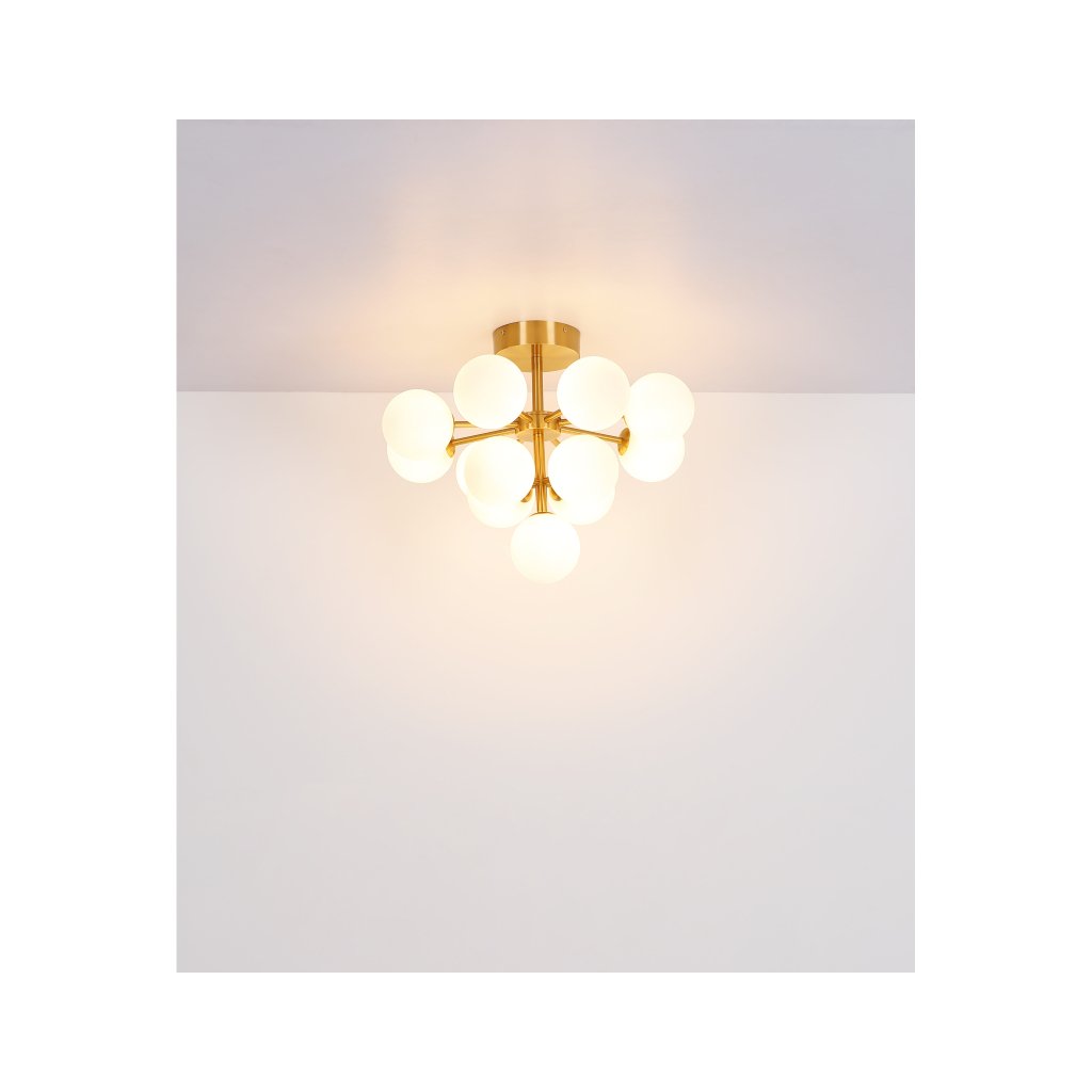 Stropné svietidlo je skutočnou ozdobou každej miestnosti. Vďaka modernému dizajnu a množstvu sklenených guľôčok bielej farby dodáva priestoru elegantný nádych. Zlaté kovové telo v kombinácii s bielymi sklenenými guľami vytvára nádhernú hru svetla. Toto stropné svietidlo s priemerom 56cm. Žiarovky nie sú súčasťou balenia.