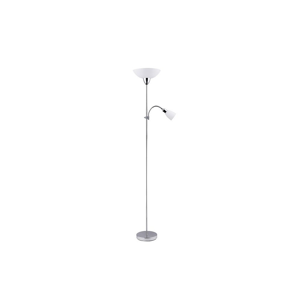 Nadčasovo vyzerajúca stojaca lampa so samostatne zapínateľným ramenom na čítanie, výška 177,5 cm, kovová konštrukcia chrómovej farby, biele opálové sklo v dolej časti a plastové tienidlo v hornej časti svietidla. Hodí sa ako osvetlenie do obývačky alebo do spálne. Žiarovka nie je v balení, odporúčame použiť LED žiarovky.