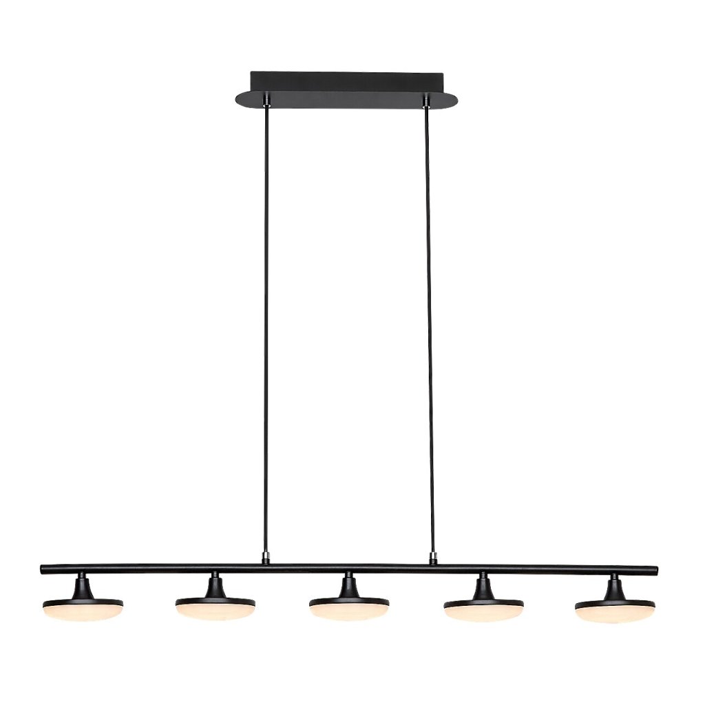 Moderný 5-žiarovkový prívesok Madi so svojím výrazným svetelným tokom a estetickým vzhľadom je skvelou voľbou do priestrannejšej obývačky alebo jedálne. Matné čierne kovové svietidlo je doplnené o biele plastové tienidlá a lampu je možné upevniť na strop pomocou predĺženej zaoblenej dekoratívnej základne. Päť okrúhlych, tanierovitých hlavíc svietidiel je umiestnených vedľa seba v rade na vodorovnej lište pripevnenej na kábli. Keďže sú hlavy svietidiel flexibilné, ich svetlo je možné nasmerovať do miestnosti podľa želania. Madi má zabudované LED svetelné zdroje energetickej triedy F s výkonom 20 W, svetelným tokom 1 850 lúmenov s tienidlom a 2 500 lúmenov bez tienidla a životnosťou 30 000 hodín. Farebná teplota svetelných zdrojov je 3 000 K a vyžarujú teplé biele svetlo, ktoré vám pomôže vytvoriť útulnú, intímnu atmosféru a je pre vaše oči relaxačné. Rozmery Madi 5-žiarovkového prívesku sú nasledovné: šírka 920 mm, vzdialenosť od stropu nastaviteľná v rozmedzí 800–1 500 mm, priemer každého tienidla 120 mm.