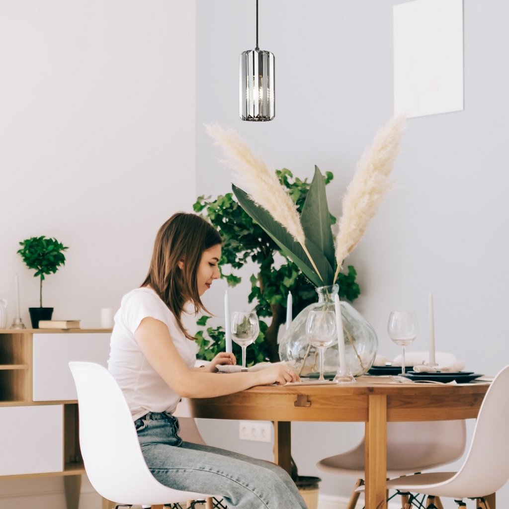 Jednodielny prívesok Veness v klasickom štýle môže byť elegantnou voľbou do obývacej izby, jedálne alebo spálne. Lampa z matného čierneho kovu je doplnená valcovým tienidlom z tónovaného skla a možno ju upevniť na strop pomocou malej okrúhlej dekoratívnej základne. Svetlo žiarovky sa záhadne filtruje medzi trojuholníkovými prvkami, ktoré tvoria tienidlo, čo vedie k veľmi útulnému osvetleniu. Veness je možné použiť s jednou žiarovkou s výkonom až 40 W. Typ objímky E27. V závislosti od vašich preferencií si môžete vybrať svetelný zdroj vyžarujúci teplé alebo prirodzené biele svetlo, ak však chcete lampu použiť v spálni, rozhodne sa odporúča prevádzkovať ju so žiarovkou vyžarujúcou teplé biele svetlo. Tento typ svetla uvoľňuje oči a prispieva k útulnej, intímnej atmosfére. Rozmery závesného svietidla Veness sú nasledovné: priemer tienidla 105 mm, jeho výška 200 mm, vzdialenosť svietidla od stropu 1200 mm, montážny priemer 90 mm. Tento model je dodávaný bez svetelného zdroja.