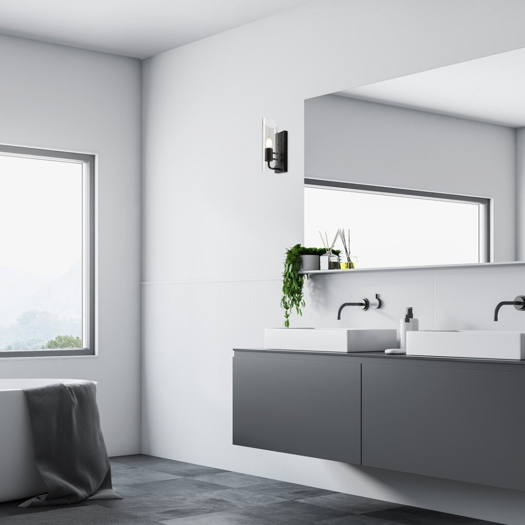 Kúpeľňové nástenné svietidlo Teodoro je skvelou voľbou do vašej modernej kúpeľne, kde ho môžete namontovať v blízkosti zrkadla a poskytnúť tak osvetlenie potrebné pre vaše aktivity. Kovový model čiernej farby je doplnený o priehľadné sklenené tienidlo a je možné ho upevniť na stenu pomocou vertikálne namontovaného podlhovastého dekoratívneho podstavca. Zúbkované valcové tienidlo je hore a dole otvorené a umožňuje plne vidieť zdroj svetla, preto je dobré použiť tento model s estetickou žiarovkou s netradičným tvarom. Teodoro je možné prevádzkovať s jednou žiarovkou s výkonom až 12 W, typ objímky E14. Ak chcete v kúpeľni dosiahnuť čistý, moderný efekt, odporúča sa použiť lampu so žiarovkou vyžarujúcou prirodzené biele svetlo. Krytie Teodoro IP44 zaisťuje, že tento model je chránený proti vniknutiu pevných častíc s priemerom 1 mm a viac a proti striekajúcej vode z akéhokoľvek smeru. Výška nástenného kúpeľňového svietidla je 270 mm, vzdialenosť od steny 120 mm, priemer tienidla 80 mm.