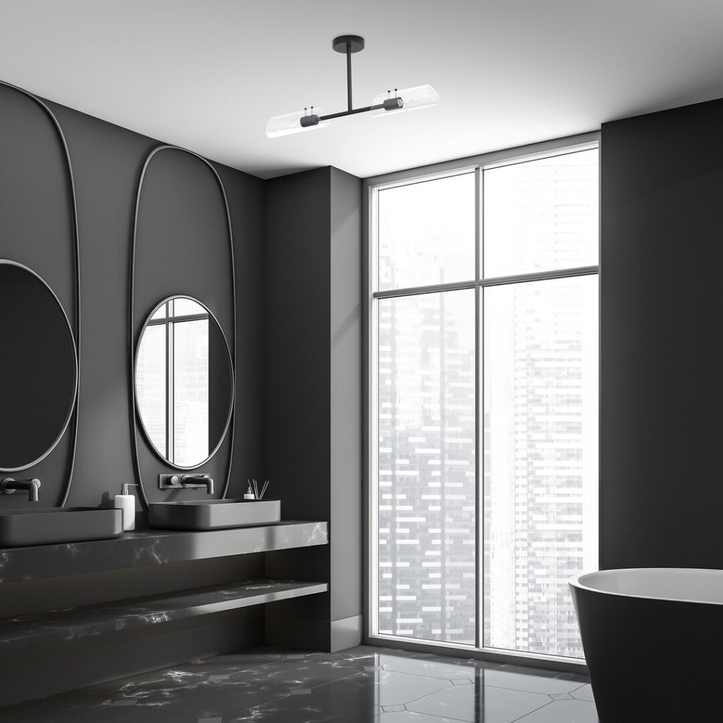 Kúpeľňové stropné svietidlo Teodoro s jedinečným dizajnom môže byť štýlovým kúskom zariadenia vašej modernej kúpeľne. Čierna kovová lampa sa skladá z prvku v tvare T pripevneného k malej, okrúhlej dekoratívnej základni a z hláv svietidla pripevnených k vyššie uvedenému prvku. Zúbkované valcové tienidlá sú vyrobené zo skla, preto je vhodné použiť tento model s estetickými žiarovkami s netradičným tvarom. Teodoro je možné prevádzkovať s dvoma žiarovkami, každá s výkonom do 12 W. Typ objímky je E14. Ak chcete v kúpeľni dosiahnuť moderný čistý efekt, použite toto svietidlo so žiarovkami vyžarujúcimi prirodzené biele svetlo. Krytie Teodoro IP44 zaisťuje, že tento model je chránený proti vniknutiu pevných častíc s priemerom 1 mm a viac a proti striekajúcej vode z akéhokoľvek smeru. Šírka svietidla je 730 mm, vzdialenosť od stropu 320 mm, inštalačný priemer 120 mm, priemer každého tienidla 80 mm, ich dĺžka 270 mm. Tento model je dodávaný bez svetelných zdrojov.