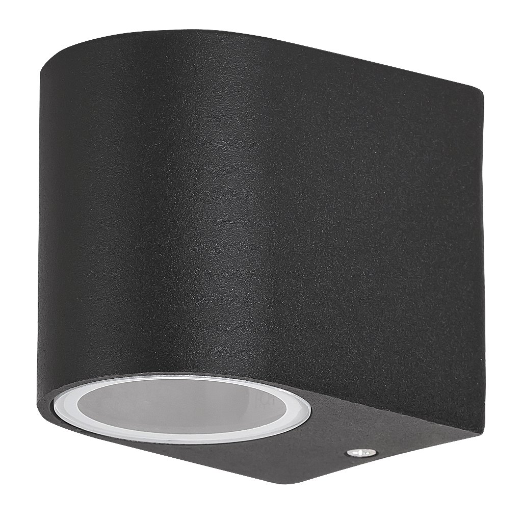 Vonkajšie nástenné svietidlo moderného vzhľadu s 1 objímkou, osvetlené smerom nadol. 8 cm vysoké a 6,5 cm široké svietidlo z čierneho kovu a skleneného tienidla. Žiarovka nie je v balení, odporúčame použiť LED žiarovky.