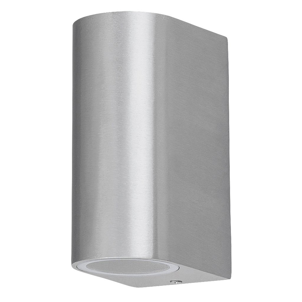 Vonkajšie nástenné svietidlo moderného vzhľadu s 2 objímkami, svieti hore a dole. 14,5 cm vysoké a 6,5 cm široké svietidlo z brúseného hliníka a skleneného tienidla. Žiarovka nie je v balení, odporúčame použiť LED žiarovky.