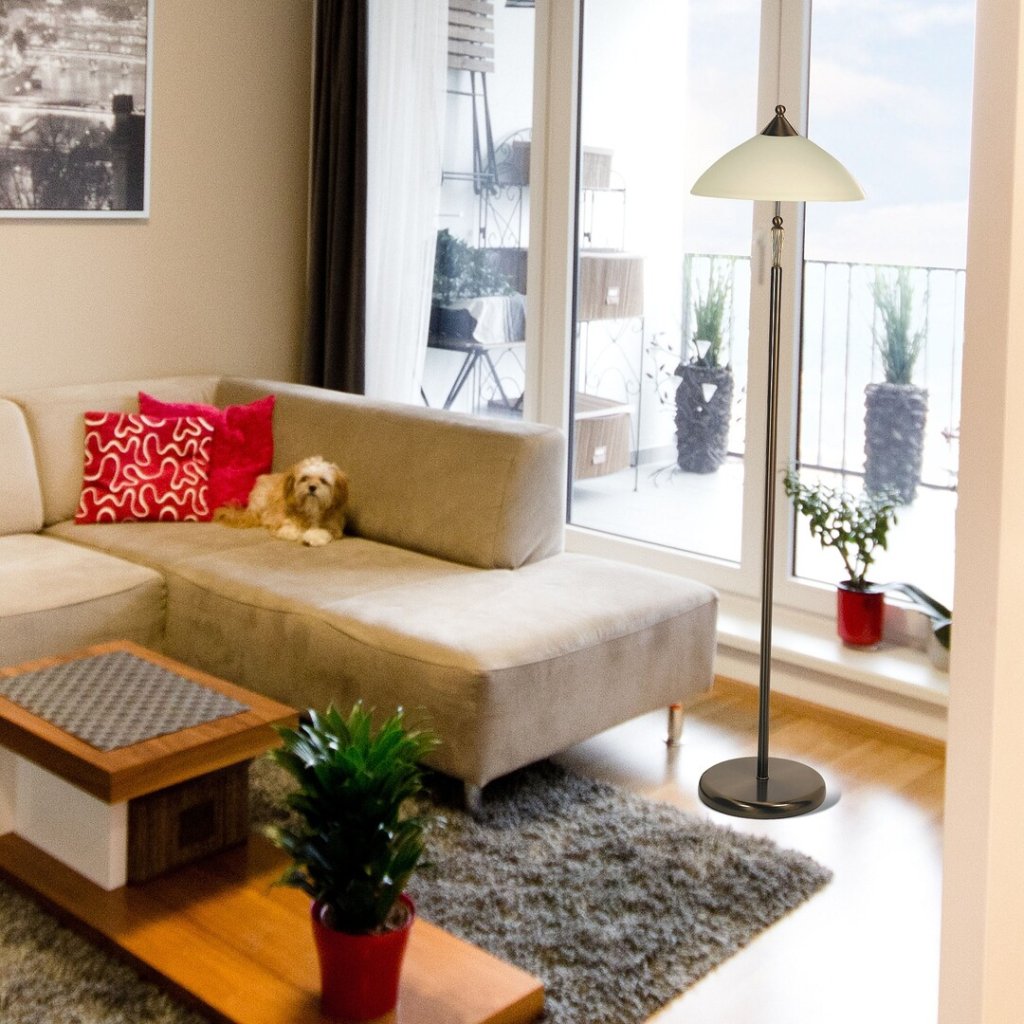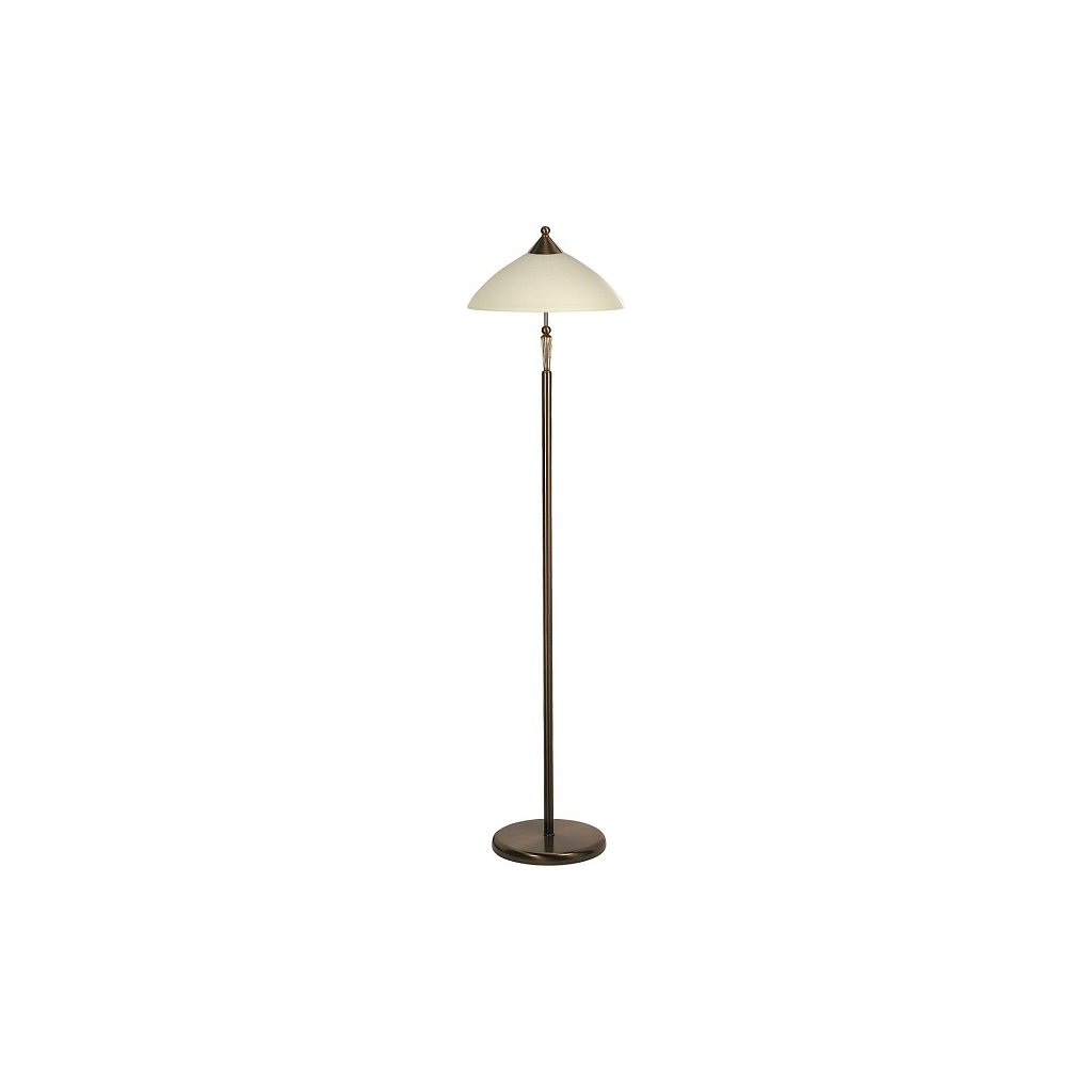 Klasicky vyzerajúca stojaca lampa s 1 objímkou. 166 cm vysoké, 40 cm priemer, bronzové kovové svietidlo s krémovým skleneným tienidlom. Žiarovka nie je v balení, odporúčame použiť LED žiarovky.