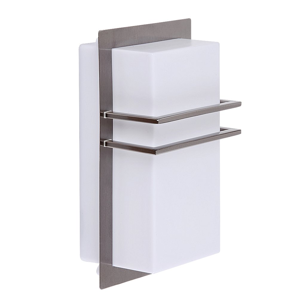 Vonkajšie nástenné svietidlo moderného vzhľadu s UV odolným dizajnom a krytím IP44 proti striekajúcej vode a prachu. Svietidlo je vyrobené z nehrdzavejúcej ocele a plastového tienidla. Svietidlo je možné použiť iba s LED žiarovkou.