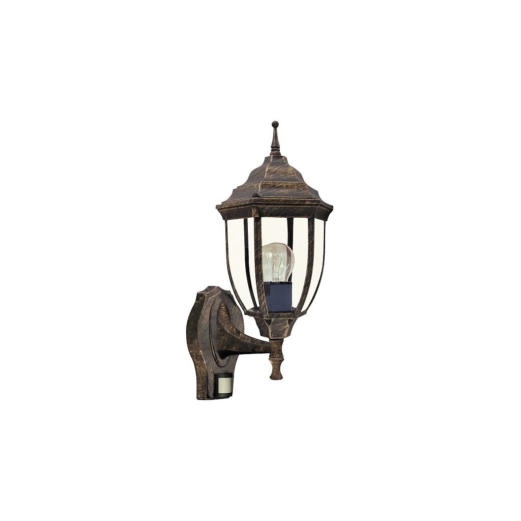 Vonkajšie nástenné svietidlo klasického vzhľadu so vstavaným pohybovým senzorom. Starožitné zlaté kovové svietidlo a tienidlo z číreho skla s krytím IP43 proti striekajúcej vode. Pri umiestňovaní svietidla dbajte na to, aby bol snímač pod uhlom 120 stupňov, max. Deteguje pohyb na vzdialenosť 8 metrov.