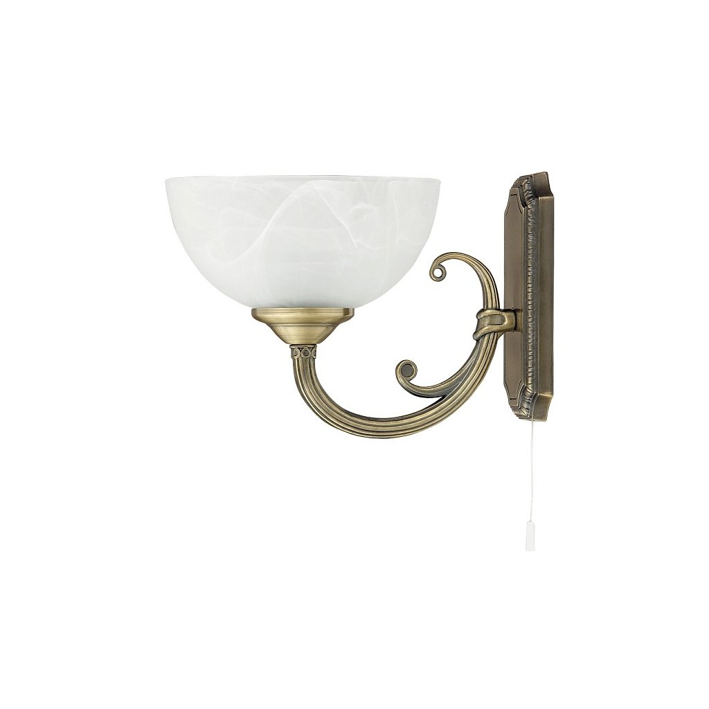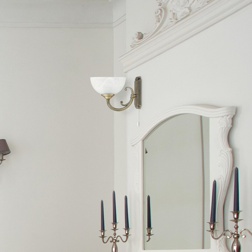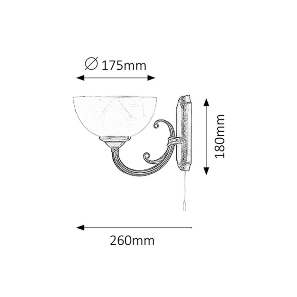 Nástenné svietidlo v jednoduchom prevedení je vhodné do klasický ladených interiérov. Svietidlo je vyrobené z kovu bronzovej farby s bielym alabastrovým sklom. Hodí sa ako osvetlenie do obývačky, jedálne alebo chodby. Žiarovka nie je v balení, odporúčame použiť LED žiarovky. Jednoduché zapínanie a vypínanie pomocou šnúrového vypínača.